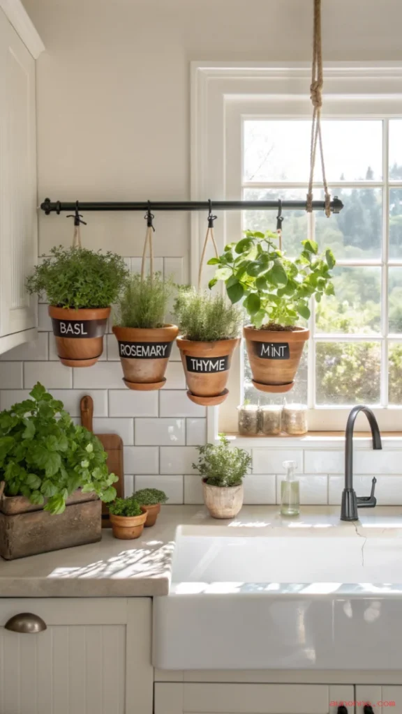 Mount a horizontal rod, a repurposed wooden ladder, or a simple metal pipe above your kitchen window and attach small S-hooks to hang each herb pot from. The natural light near the window keeps the herbs healthy and productive throughout the year.