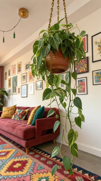 You can guide the trailing vines along a wall using small adhesive hooks, letting the plant create a living wall effect as it grows. This takes almost no effort beyond the occasional watering and gives the room a lush, jungle-like atmosphere over time.