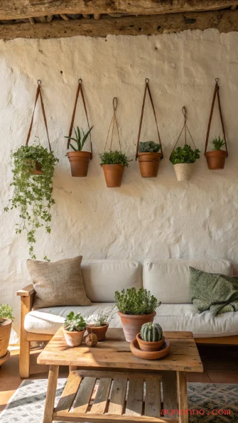 A simple wooden dowel mounted horizontally from the ceiling becomes a stunning natural plant bar when you hang several plants from it. You can attach small hooks along the dowel and use simple jute twine or leather cord to suspend different pots at varying lengths. This approach works especially well with herbs, small trailing ferns, and compact pothos varieties.