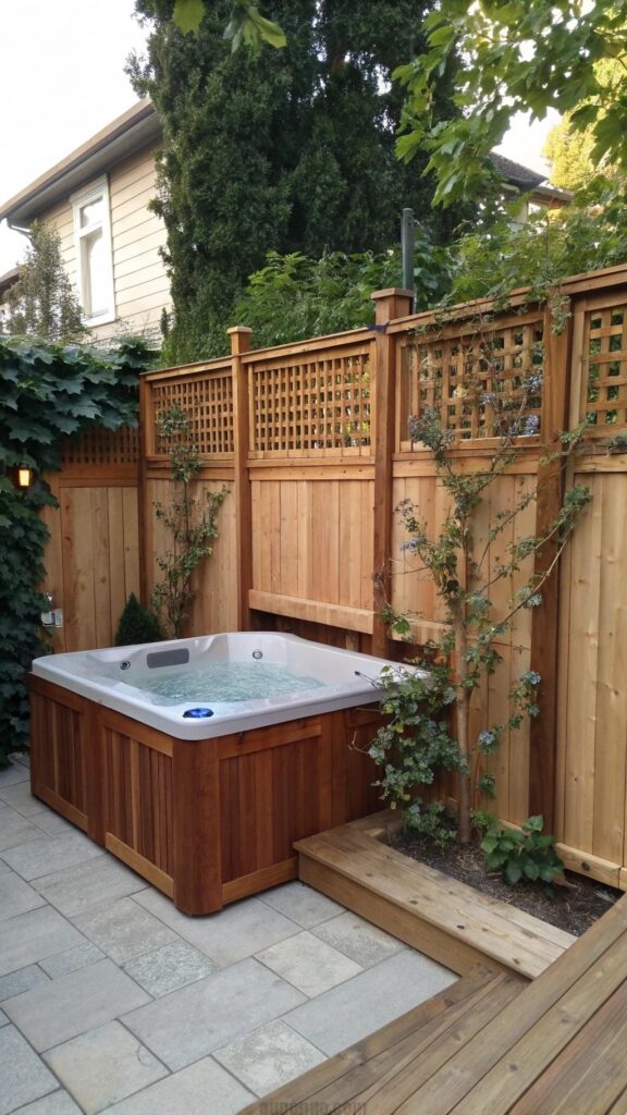 Contemporary cedar fencing creates private sophisticated oases perfect for intimate jacuzzi experiences. The rich warm tones of cedar complement outdoor spa installations while providing long-lasting durability against weather elements. Strategic fence placement offers seclusion without sacrificing natural light or air circulation.