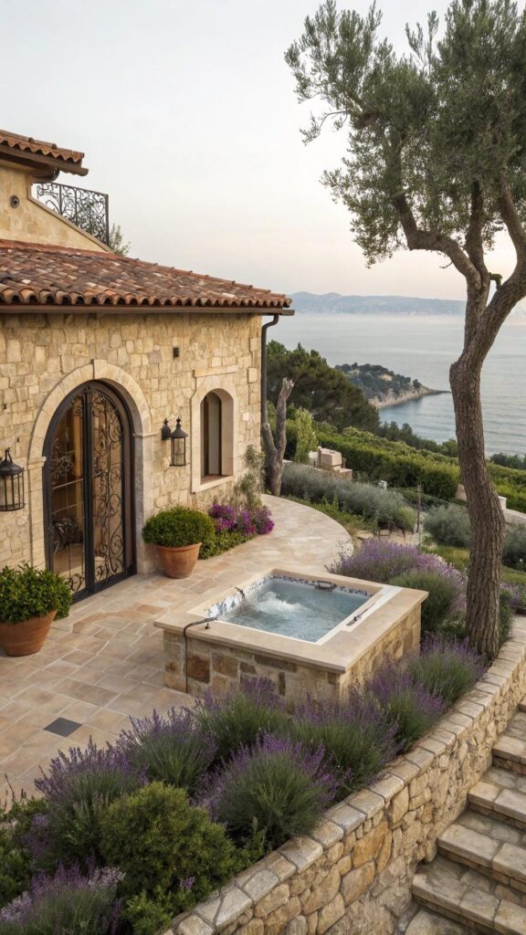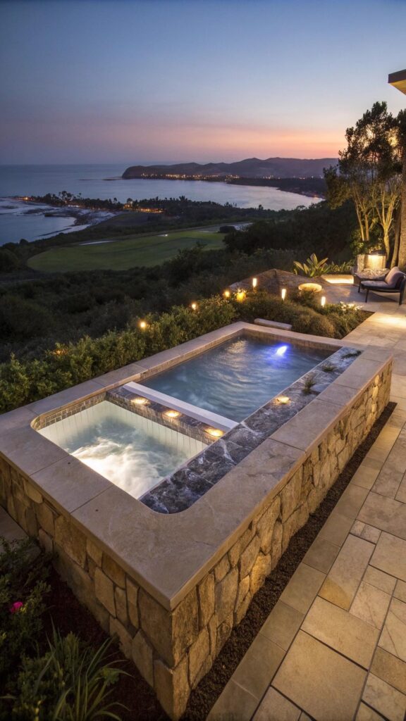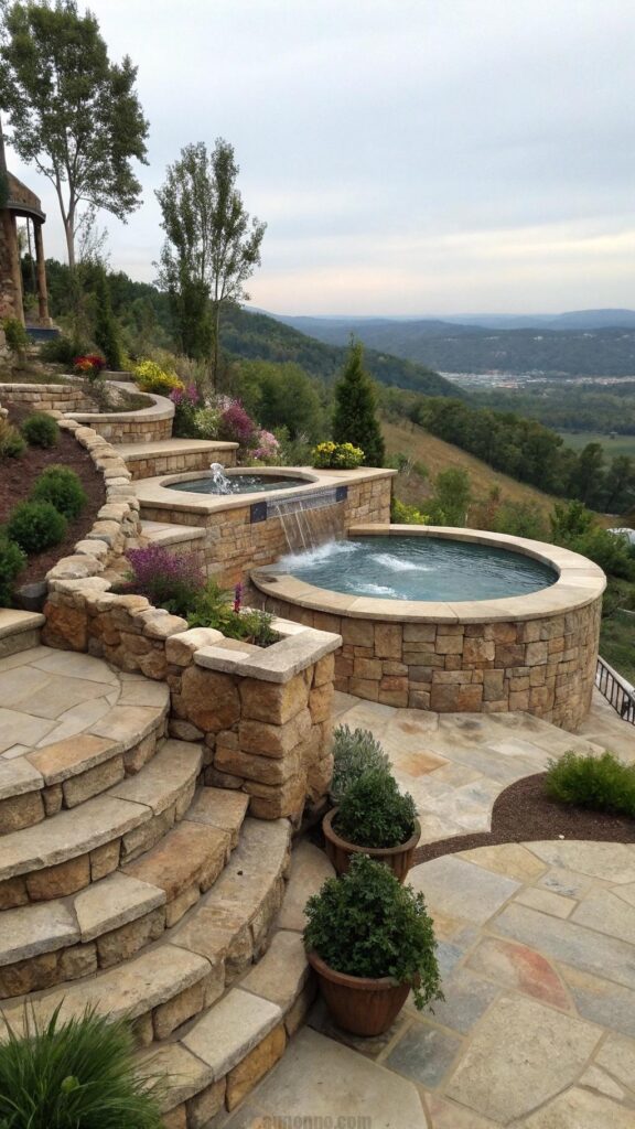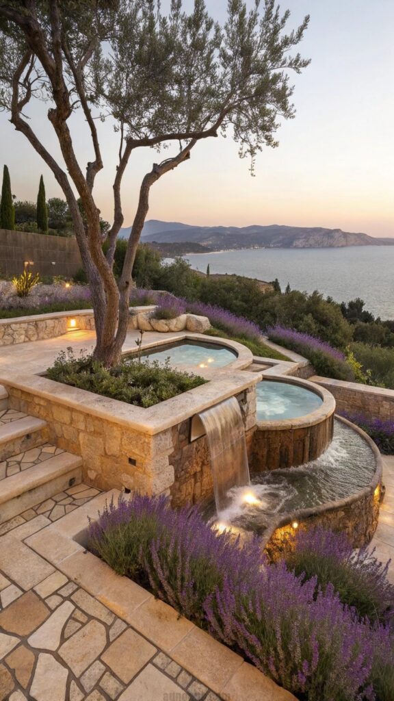 The cascading design incorporates multiple water levels that flow gracefully into the main jacuzzi area. Natural stone materials and warm earth tones create an authentic Mediterranean atmosphere. Integrated planters with olive trees and lavender enhance the coastal European aesthetic.