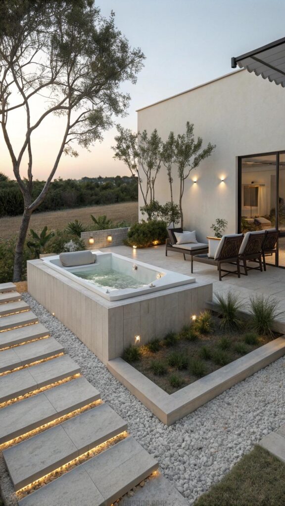 Minimalist design principles create serene environments that emphasize clean lines and uncluttered aesthetics. Neutral color palettes with gravel pathways and simple plantings focus attention on the jacuzzi experience rather than decorative distractions. The sophisticated simplicity promotes deep relaxation and mental clarity.