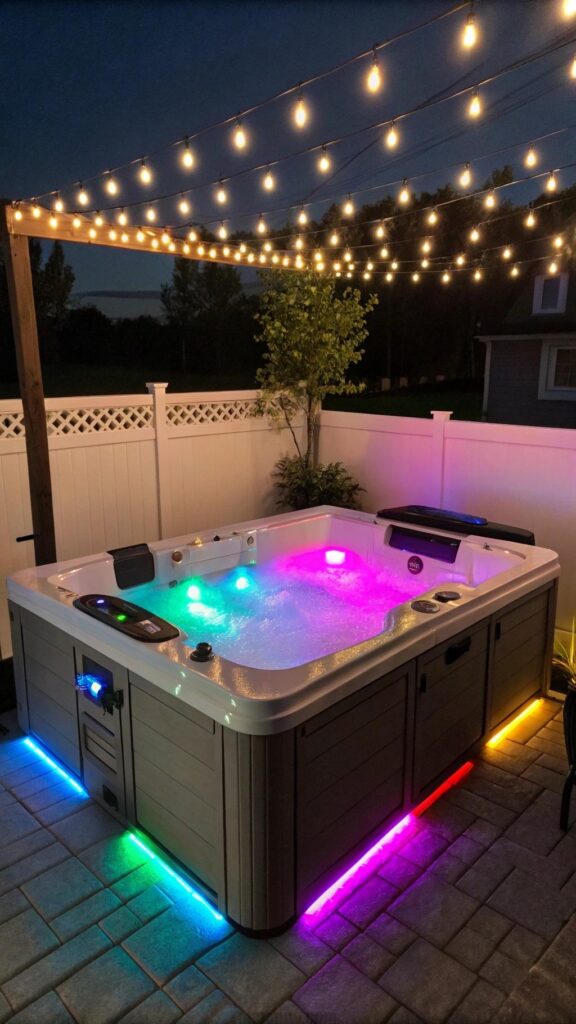 Built-in spa lighting creates underwater illumination while perimeter cabinet lighting adds subtle ambient glow around the installation. Color psychology principles guide lighting choices with blue for calm relaxation, red for warmth, and green for natural grounding effects. Remote controls and music-syncing features enhance the entertainment experience.