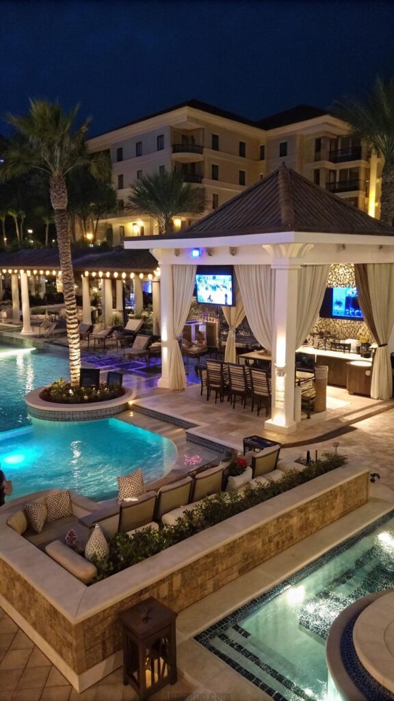 Integrated water features like small fountains or cascading elements complement the tropical theme with natural sound effects. Palm fronds and tropical flowers provide exotic fragrances that enhance relaxation. Your backyard transforms into a year-round vacation destination that rivals expensive resort experiences.