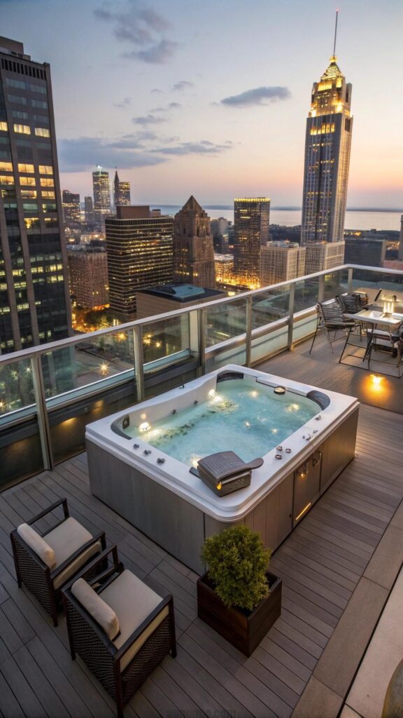 Rooftop jacuzzis maximize urban outdoor space while providing spectacular city views and privacy. Professional structural engineering ensures safe weight distribution for water-filled installations on elevated surfaces. The elevated position offers escape from street-level noise and creates exclusive outdoor retreats.