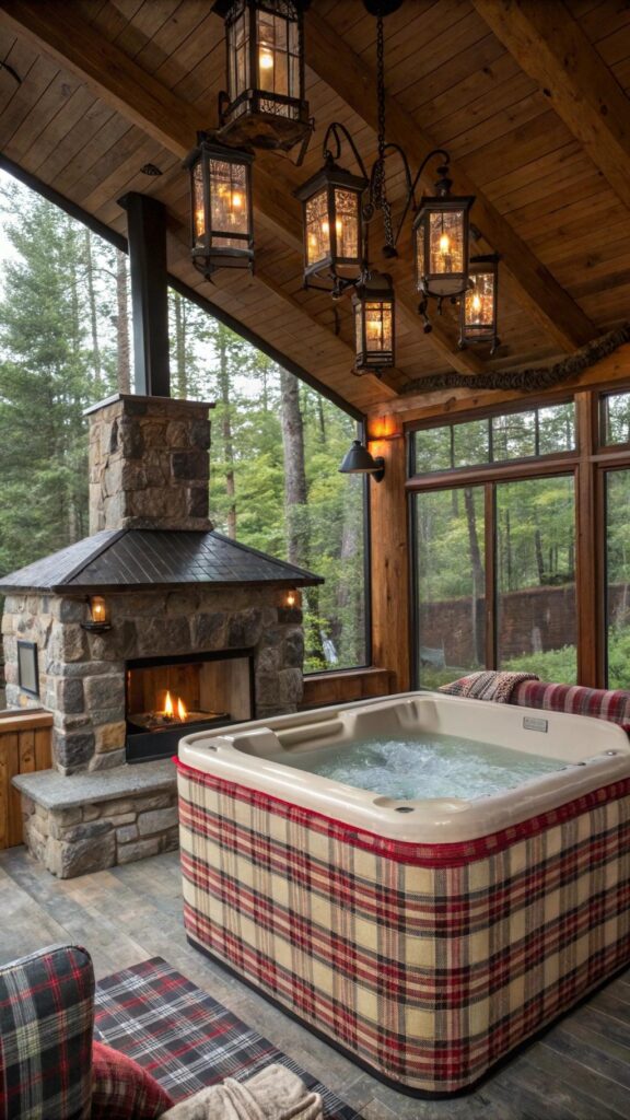 Rustic cabin aesthetics combine warm plaid patterns, wooden accents, and cozy fireplace elements. The vintage approach uses reclaimed materials and weathered finishes that develop character over time. Authentic details like lanterns and rough-hewn lumber create immersive experiences that feel like mountain retreats.