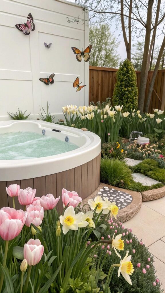 Spring-themed installations celebrate renewal with fresh greenery, floral prints, and pastel color schemes. Seasonal flower plantings like tulips and daffodils provide vibrant displays that change throughout the growing season. The fresh aesthetic promotes optimism and energy that complement therapeutic soaking experiences.