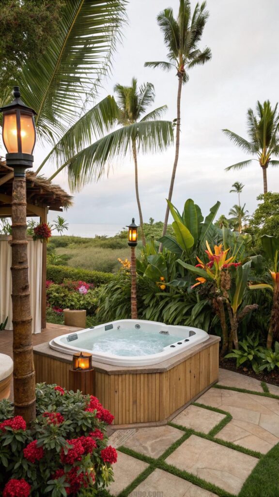 Tropical landscaping creates exotic resort-style atmospheres with palm trees, banana plants, and vibrant flowering specimens. Tiki torches provide authentic island ambiance while citronella-based options naturally repel insects during evening soaks. Bamboo accents and bright cushions complete the Caribbean paradise aesthetic.