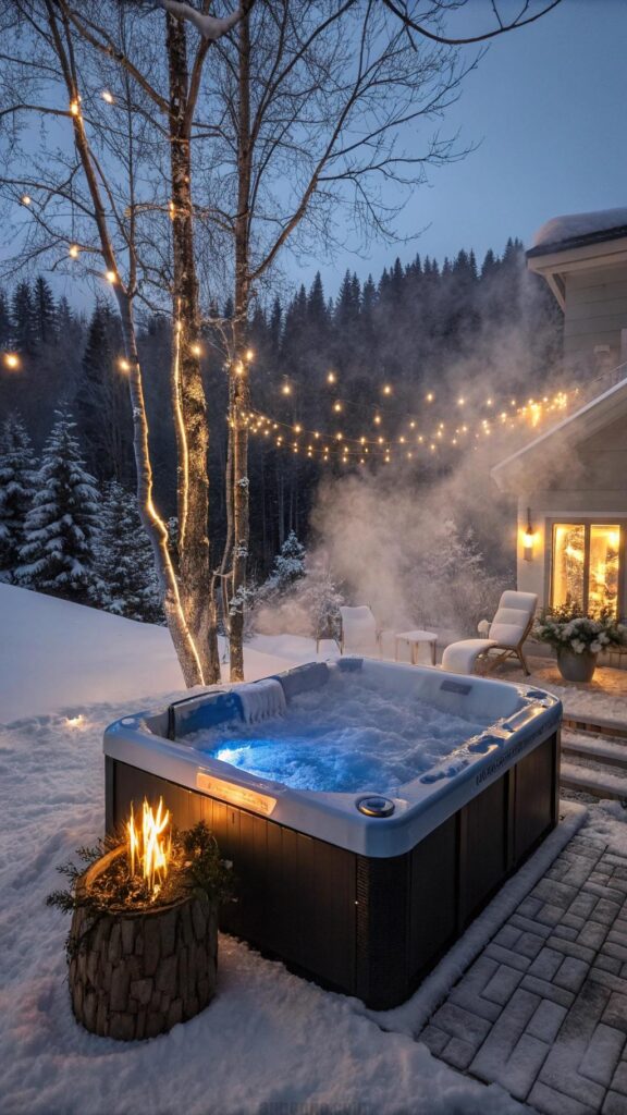 Winter-themed jacuzzi areas embrace the magical contrast between cold outdoor air and warm soaking water. Twinkling lights, faux snow, and icy blue and silver accents create enchanting winter wonderland atmospheres. Nearby fire pits or fire tables provide additional warmth and cozy gathering spaces.