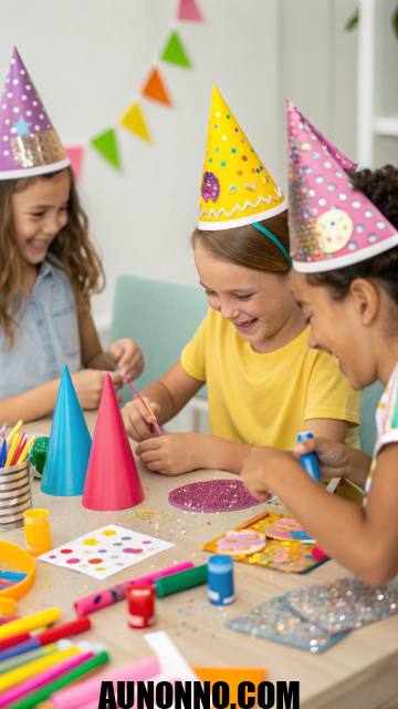 Let kids show their creativity with a DIY hat-making station. Provide plain hats, glitter, stickers, and markers. Children will love designing their own party looks.