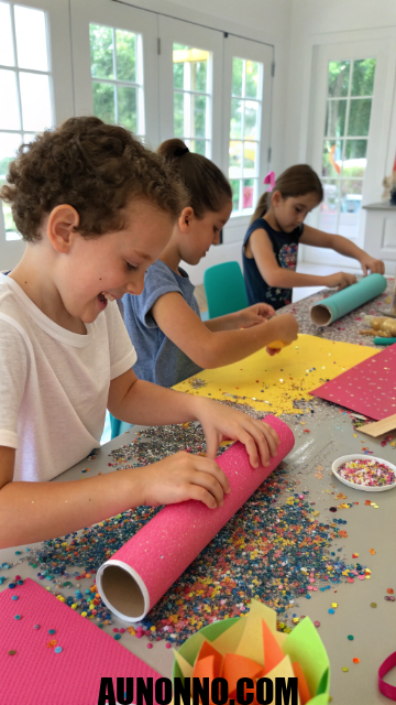 Kids love popping confetti. Set up a confetti popper station with empty paper rolls, tissue paper, and glitter. Guide them to fill, seal, and decorate their poppers.
