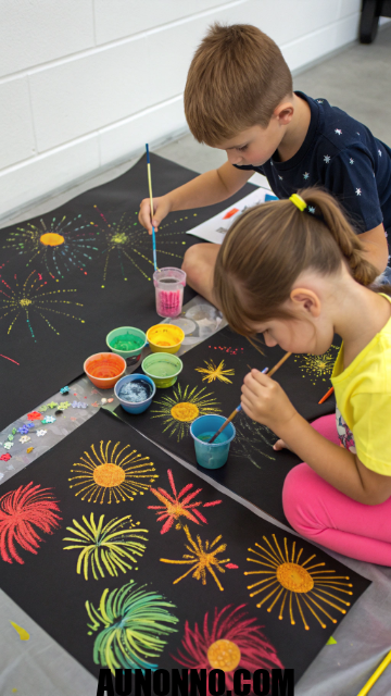 Turn creative fun into colorful decoration. Give kids black paper, chalk, and paint to draw firework designs. They can splatter or stamp bright colors for effect.
