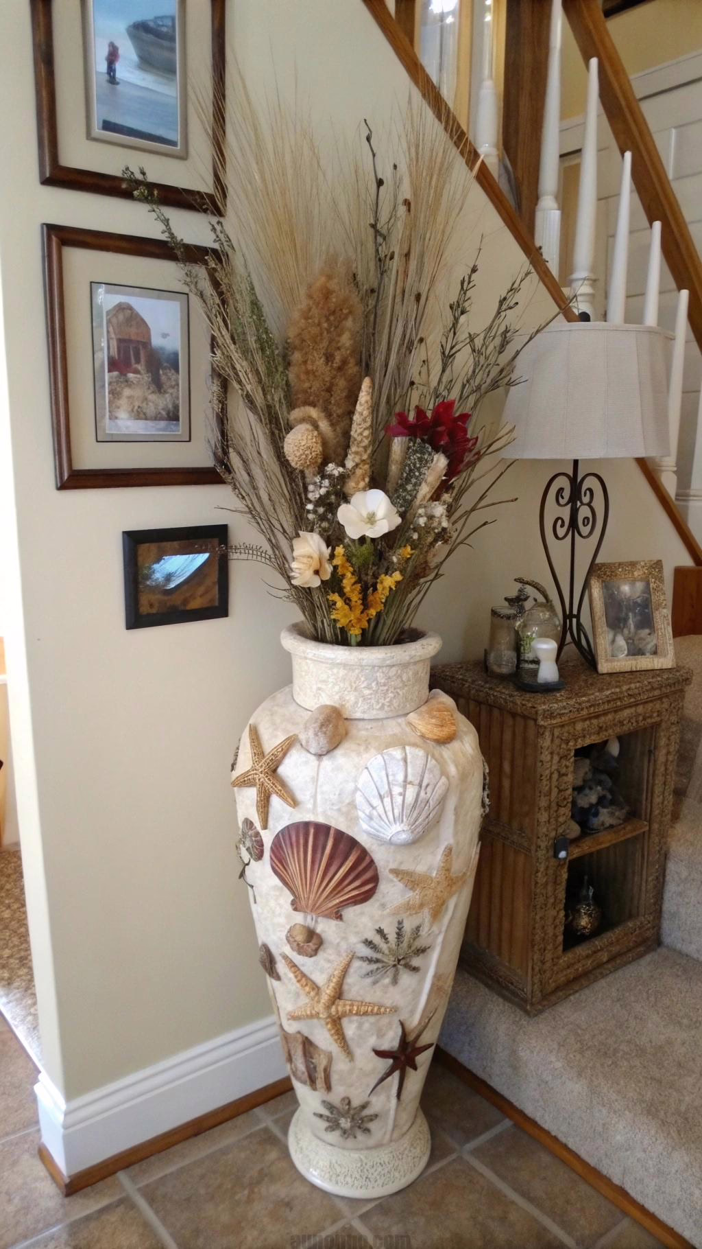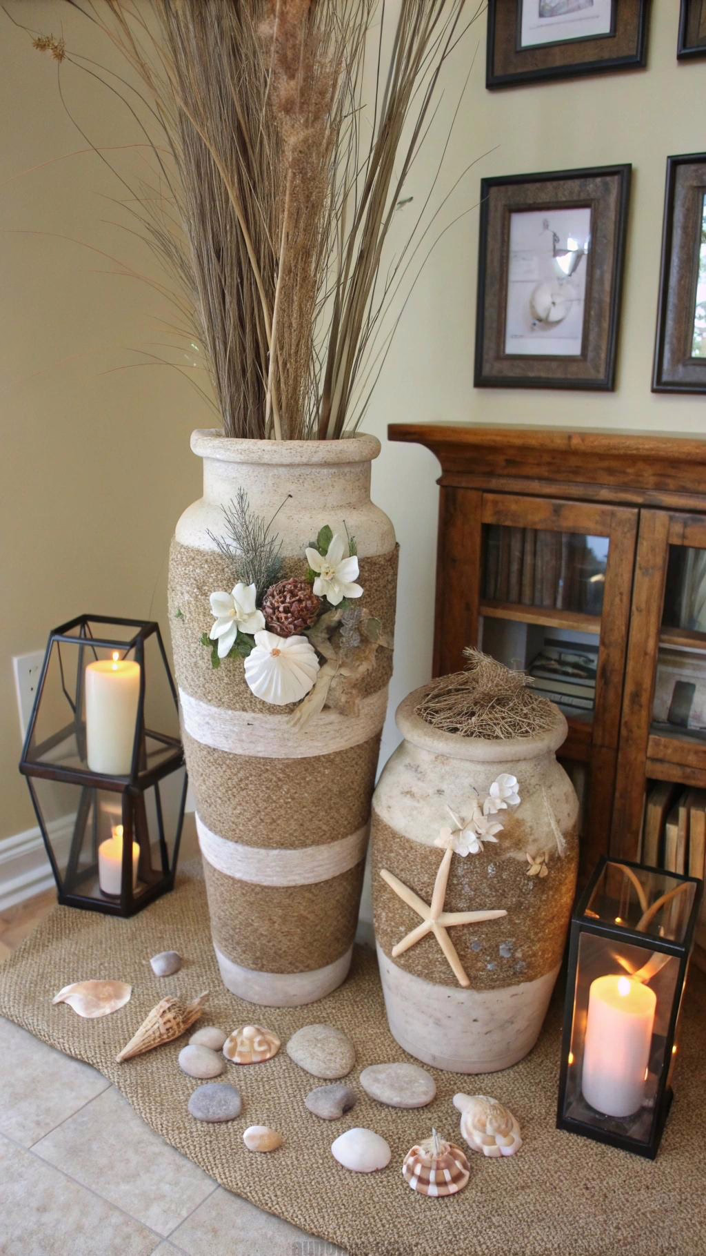 Create themed arrangements in your large floor vase to reflect your personal interests or the season. For example, a beach-themed decor can include a vase filled with seashells, sand, and dried sea oats. Alternatively, a rustic farmhouse theme can feature a vase filled with wildflowers, twigs, and burlap accents. Themed arrangements can tell a story and evoke specific feelings, making your space feel more personalized and inviting.