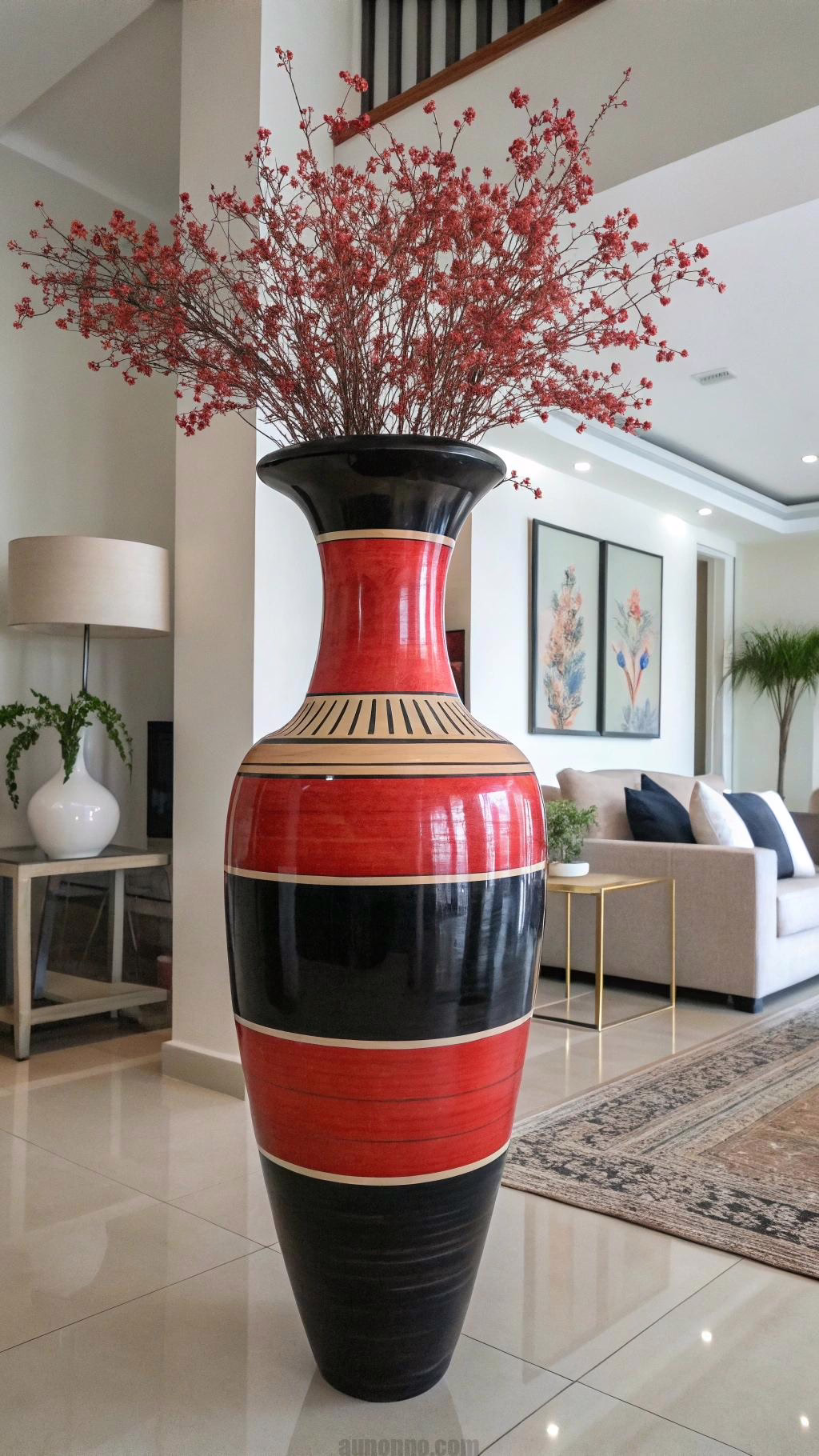 Finally, consider using a large floor vase as a statement piece in your decor. Choose an oversized vase with a bold design or unique shape that can stand alone as a work of art. This approach can create a striking focal point in any room, drawing attention and sparking conversation.