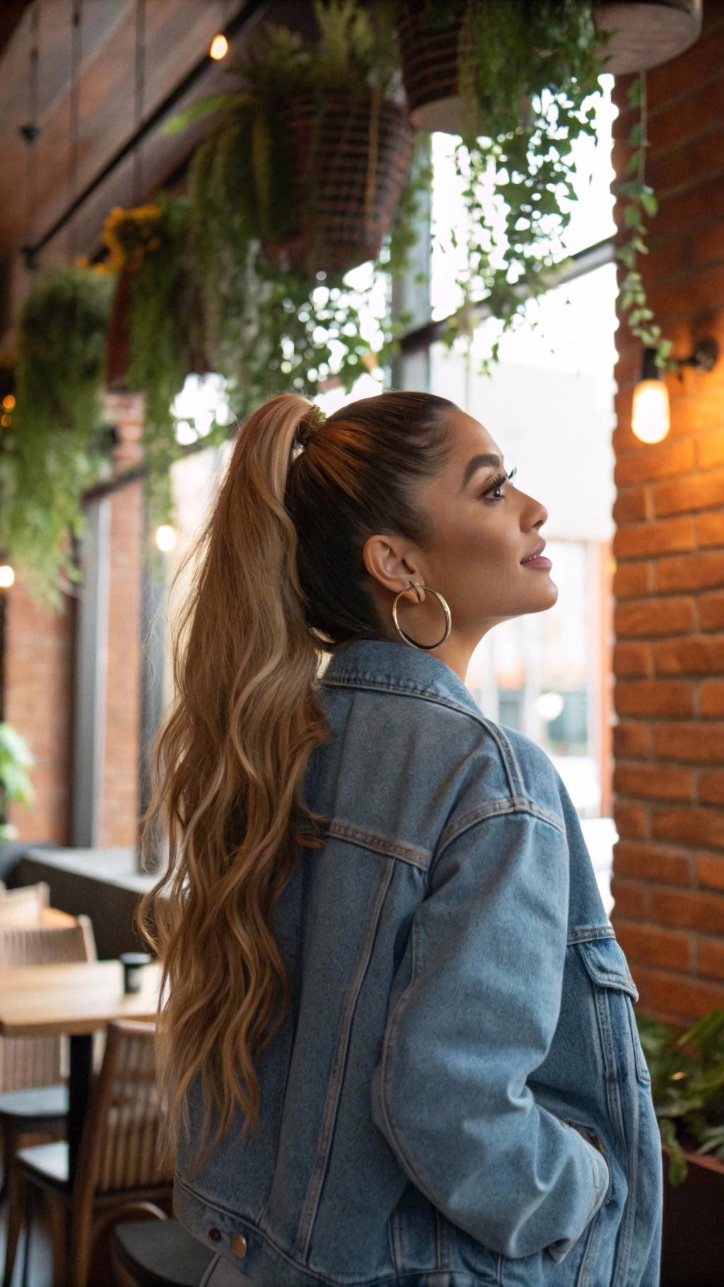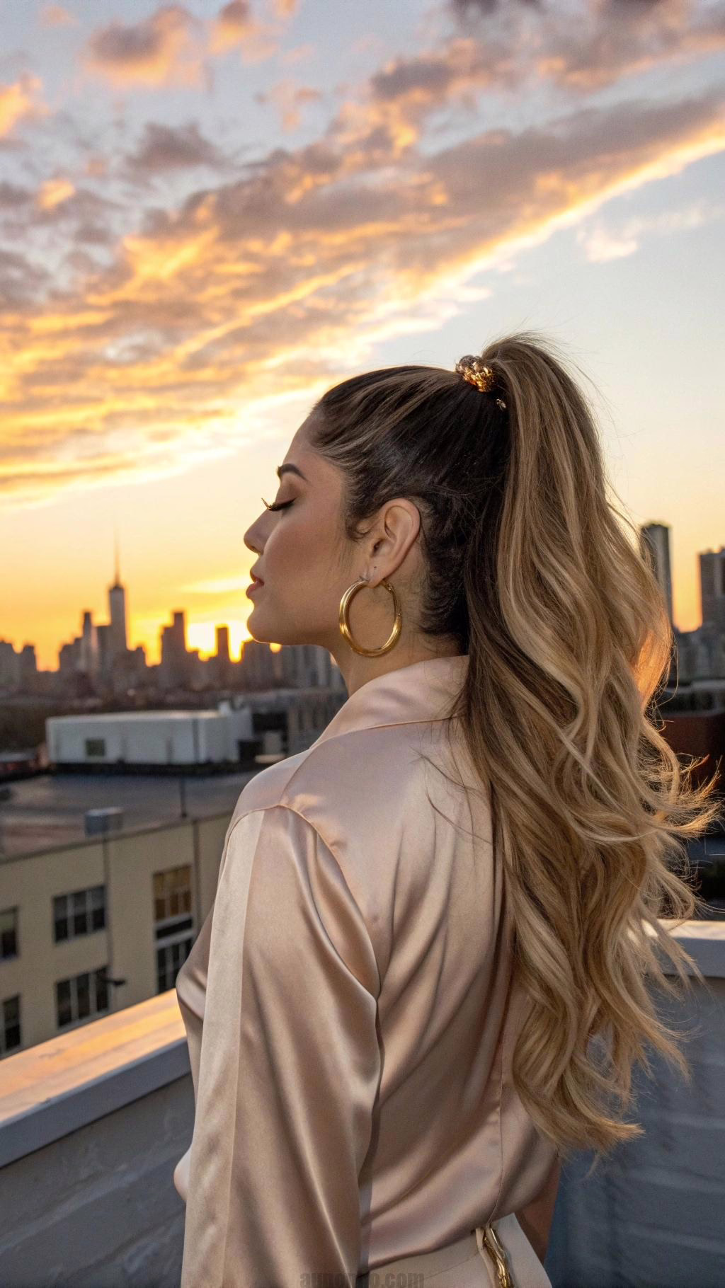 I rock a sandy blonde loose ponytail for an easy, relaxed style. I dye my hair a sandy blonde, then gather it into a low, slightly messy ponytail with strands falling out. My latina roots show in the natural wave I leave in.