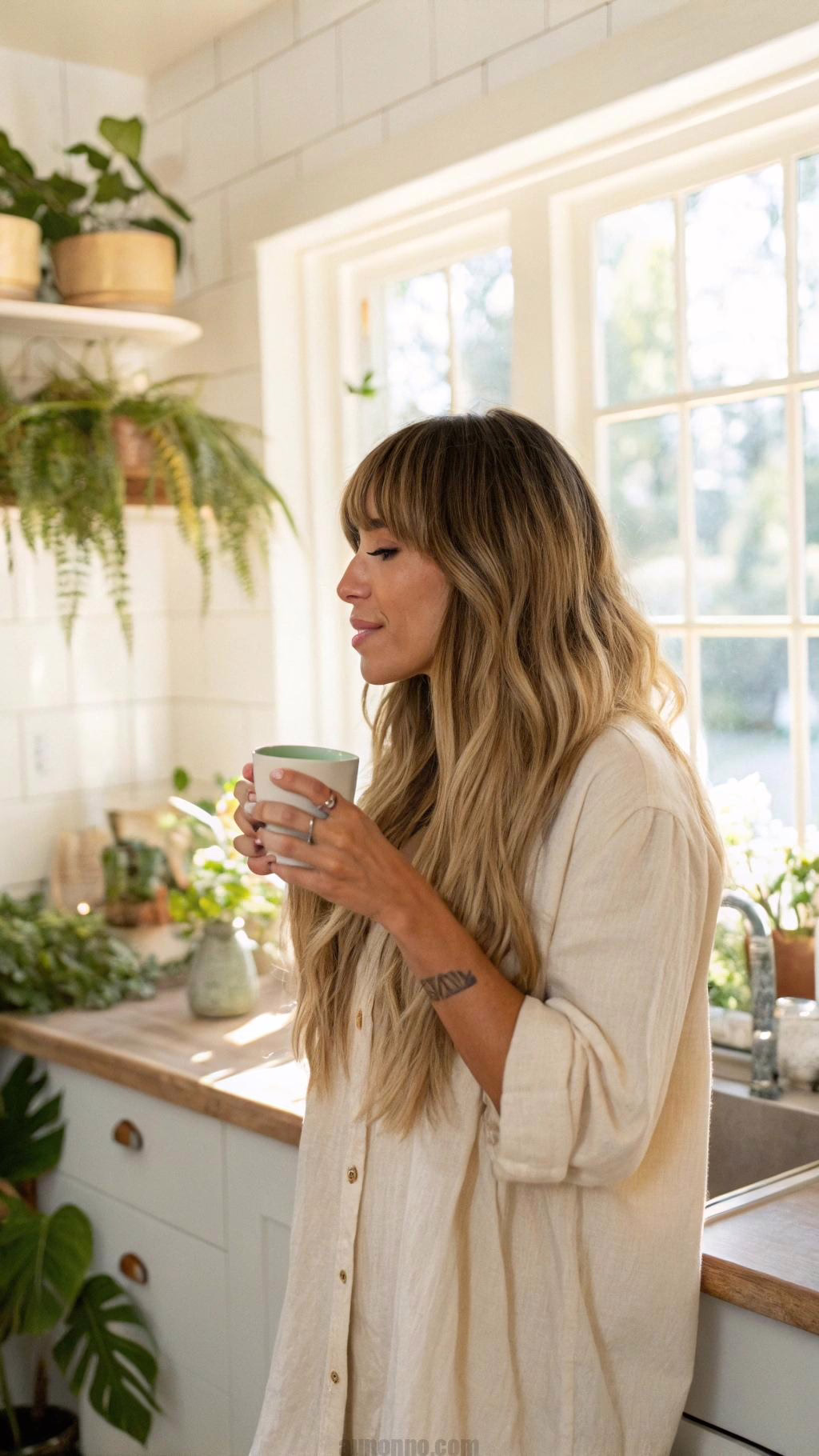 I trim the bangs myself every few weeks and style them with a round brush—it’s a 20-minute look. This style makes me feel flirty and fresh, like I’ve got a little secret glow. It’s my everyday favorite.