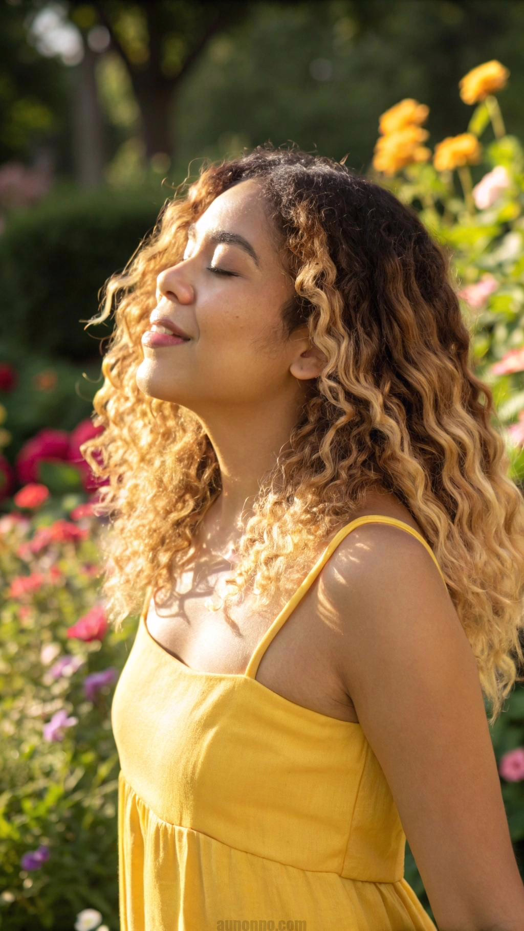 I hydrate my curls with a leave-in conditioner to keep them soft and defined. On days I want extra pop, I twist small sections at night and unravel them in the morning for tighter, springy curls. This look makes me feel like I’m radiating warmth wherever I go.