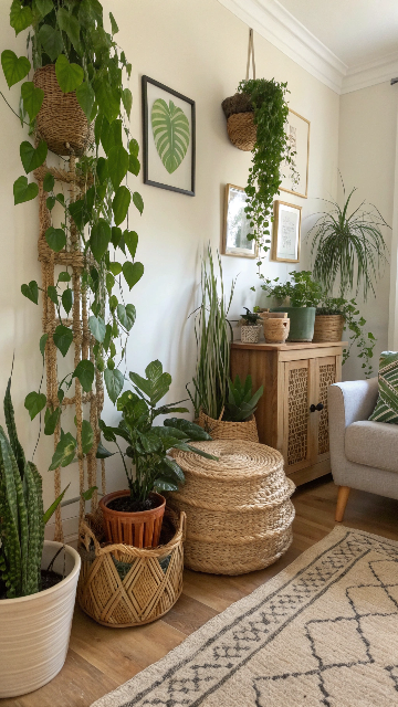 - Group plants in different containers (macrame, ceramic, woven baskets) for an eclectic look.