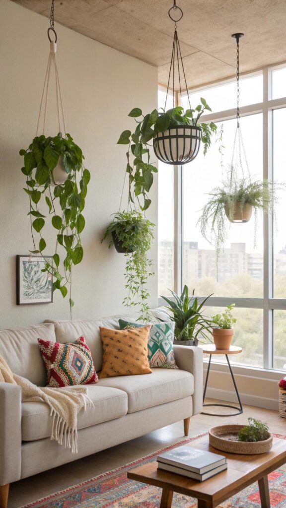 Hanging planters can create a unique, airy feel in your living room. Whether it’s a modern macrame plant hanger or a sleek minimalist design, suspended planters draw the eye upward, making the space feel larger and more dynamic. Choose plants with trailing vines, like pothos or string of pearls, for a cascading effect.