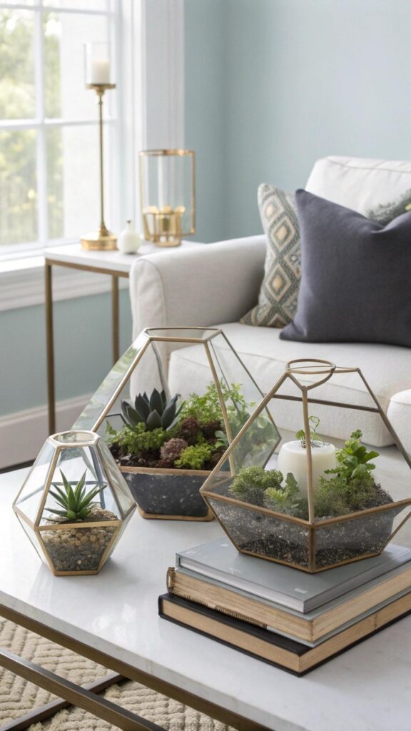 Terrariums are the perfect blend of nature and elegance. These glass enclosures house plants like succulents, moss, or small ferns, creating a mini indoor garden. They can be placed on a side table or as a centerpiece, adding a modern touch to your living room decor.