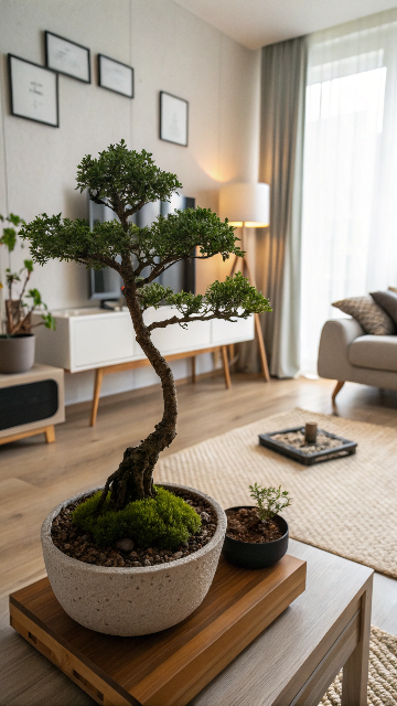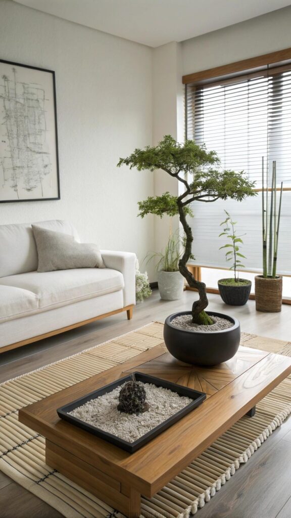 For a minimalist and serene living room, a bonsai tree in a simple pot can make all the difference. The intricate shape and size of bonsai trees add a sense of peacefulness and balance. A small zen garden on a coffee table can complement the plant and complete the tranquil ambiance.