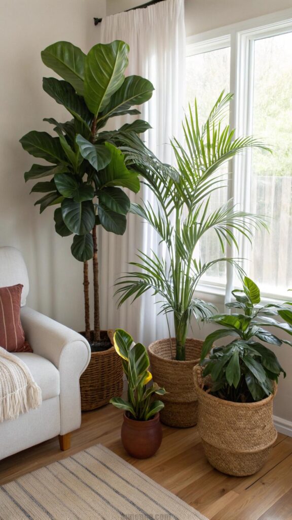 Turning a corner of your living room into a mini indoor garden can add instant vibrancy and freshness. Tall plants like fiddle leaf figs, palms, and rubber plants create a lush, green backdrop. Group them in one corner to form a garden-like vibe that offers a sense of tranquility and luxury.