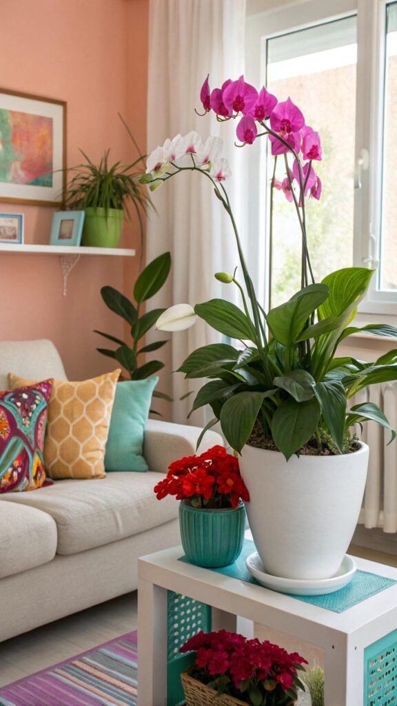 Flowering plants add bursts of color and vibrancy to your living room. Consider choosing indoor plants that bloom in shades of red, pink, or purple, such as orchids, peace lilies, or begonias. They bring life and brightness into the space.