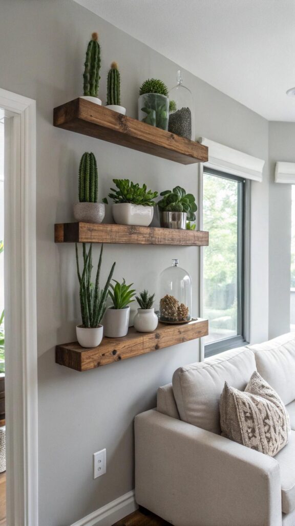 Floating shelves can be an excellent option for displaying a variety of smaller indoor plants. Arrange a collection of plants like succulents, cacti, and smaller ferns for a fresh and charming look. These shelves can be placed on the walls or beside windows, giving the room an extra dimension.