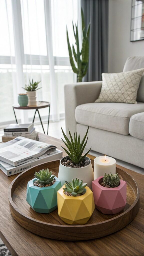 A plant placed on your coffee table can serve as an eye-catching centerpiece. Choose plants that are small to medium-sized, and pair them with decorative pots to complement your living room decor. A simple succulent arrangement or a single large statement plant like a snake plant works wonders.