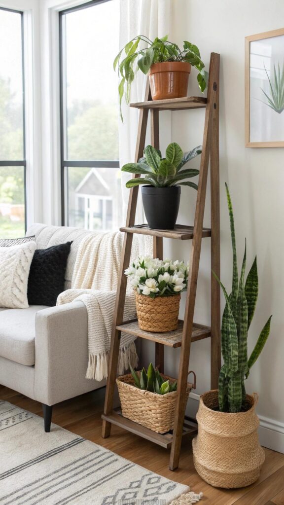 Ladder-style plant shelves are a trendy way to display indoor plants in your living room. These shelves allow you to showcase plants of varying heights, creating a visually appealing tiered effect. Place a few tall plants at the bottom and smaller ones at the top for an organized, stylish look.