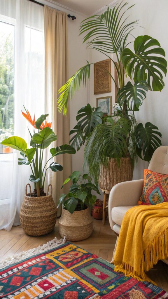 A boho-inspired plant corner can give your living room an eclectic, relaxed feel. Combine various plants, including trailing vines, leafy plants, and even air plants. Adding woven baskets or ceramic pots for plant storage completes the look and enhances the bohemian vibe.