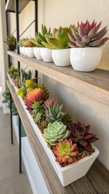 - Use a floating shelf mounted on the wall to keep the succulents in view.