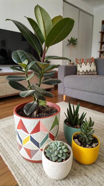 If you’re looking for something unique, try combining different types of plants and placing them in artistic, quirky containers. For example, combine a large rubber plant in a bold geometric pot with a few small succulents in painted ceramic cups. This combination adds personality and creativity to your living room.
