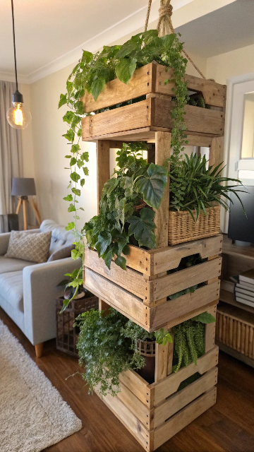 Wooden crates are an eco-friendly and rustic way to display indoor plants in your living room. Stack or hang them to create a unique display that gives your space a rustic, farm-to-table charm. Add trailing plants for a more boho look.