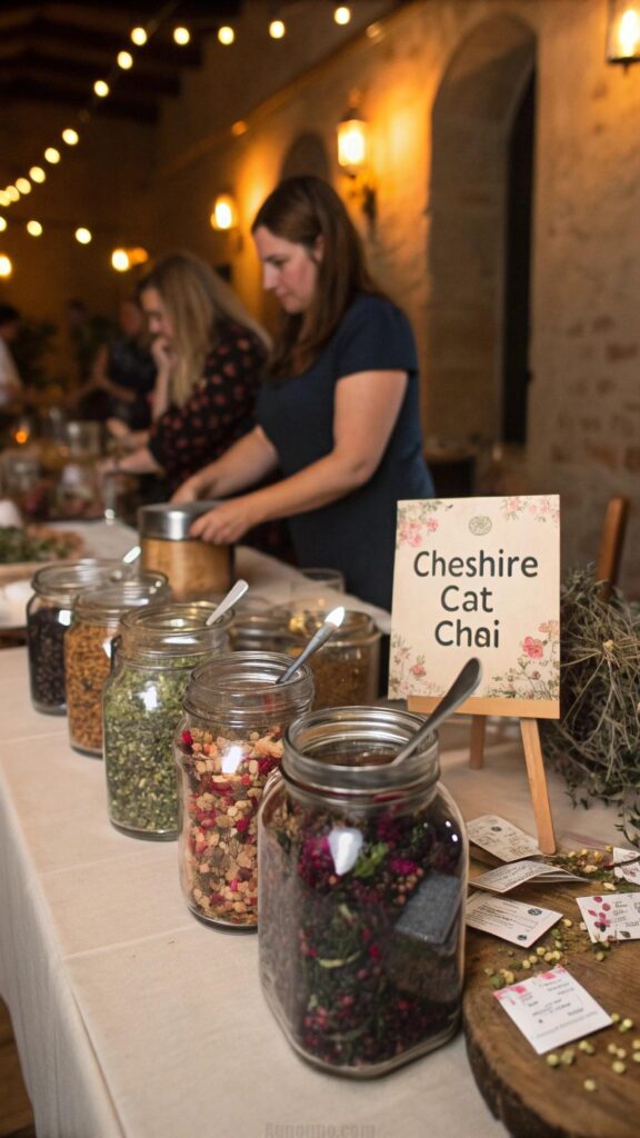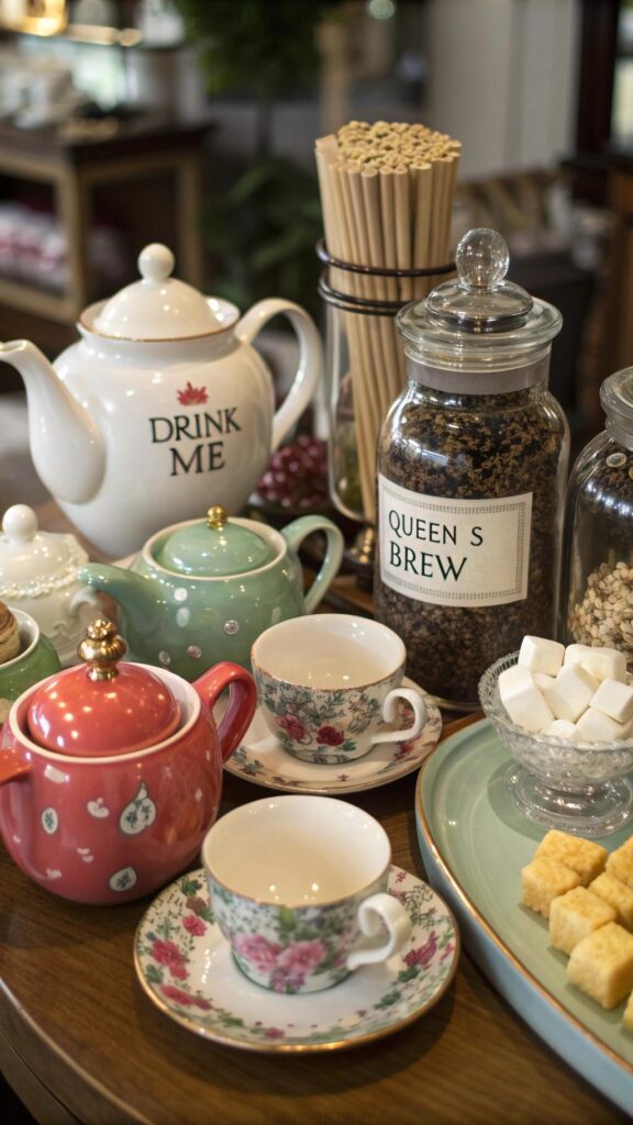 Label each ingredient with fun names like “Cheshire Cat Chai” or “White Rabbit’s Herbal Mix.” Offer guidance on flavor pairings to help guests craft the perfect blend. This interactive activity adds a personal touch to the party.