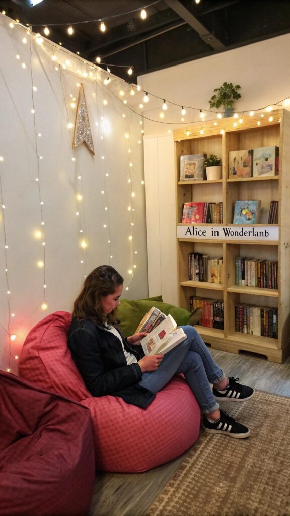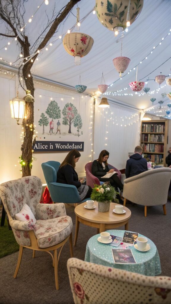 Create a cozy reading corner with copies of Alice in Wonderland and other whimsical books. Add bean bags, cushions, and fairy lights to make the space inviting. This is perfect for guests who want a quiet moment during the party.