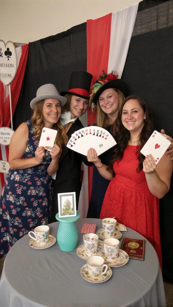 Use oversized props to create a surreal Wonderland atmosphere. Include giant teacups, playing cards, and flowers. These props make great photo opportunities and add to the whimsical vibe.
