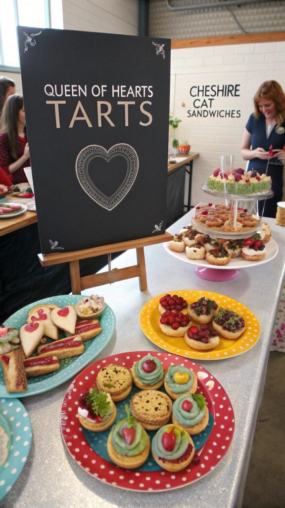 Design a menu that reflects the whimsy of Wonderland. Include items like “Queen of Hearts Tarts,” “Cheshire Cat Sandwiches,” and “Mad Hatter’s Mini Quiches.” Use colorful ingredients and playful presentations to make the food stand out.