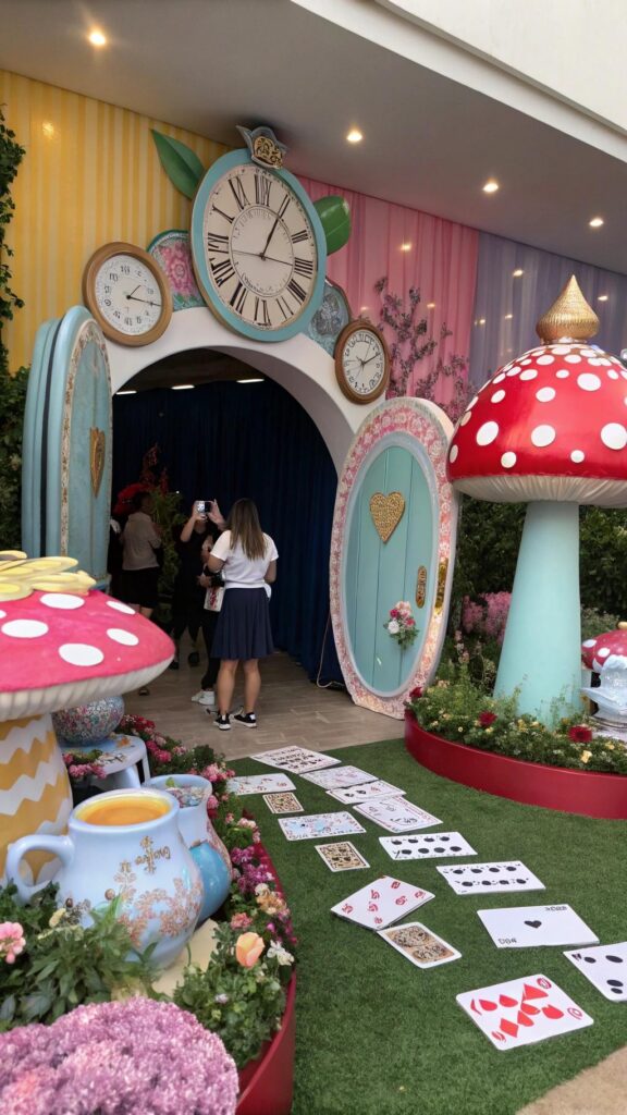 Place a giant teapot at the entrance to welcome guests. Scatter oversized mushrooms and clocks around the venue. These decorations will make everyone feel like they’ve stepped into another world.