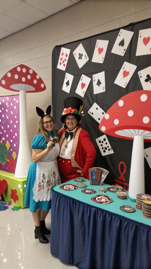 Incorporate bold colors like purple, teal, and orange for a vibrant look. Scatter playing cards, pocket watches, and faux roses as table decor. Don’t forget to include a centerpiece with a top hat or a teapot.