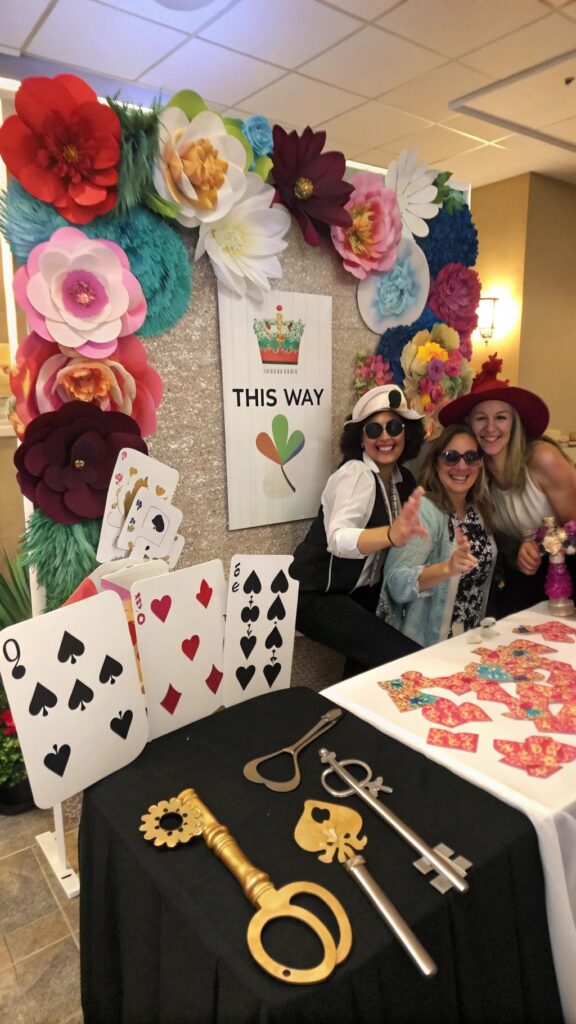 Create a photo wall with a backdrop featuring iconic Wonderland elements. Use oversized flowers, playing cards, and a “This Way” sign. Add props like hats, masks, and giant keys for guests to use in their photos.