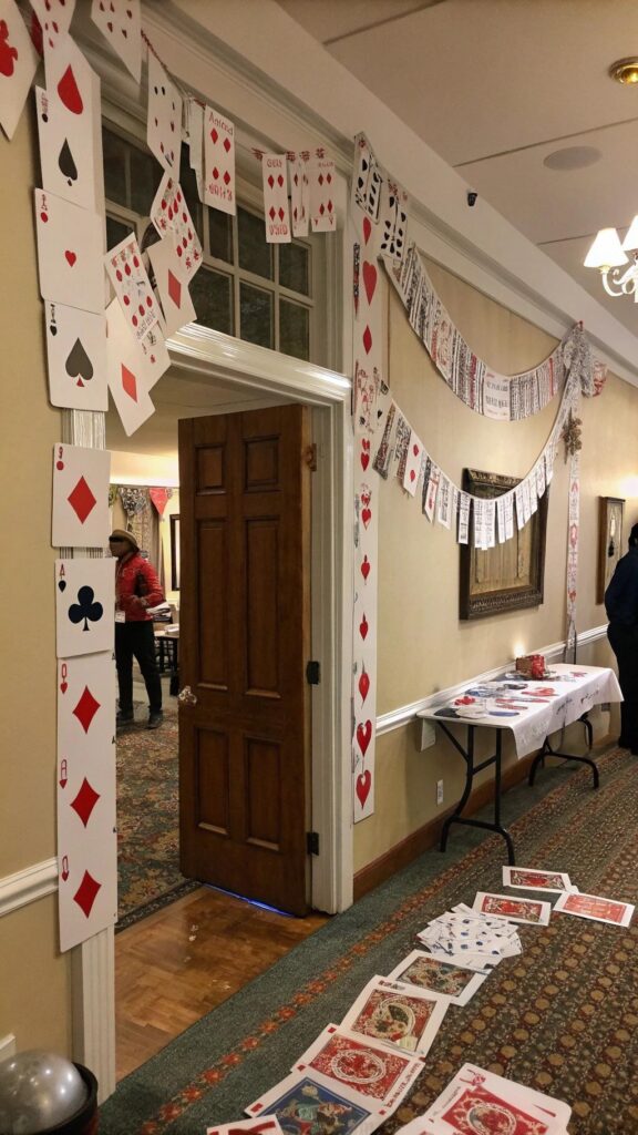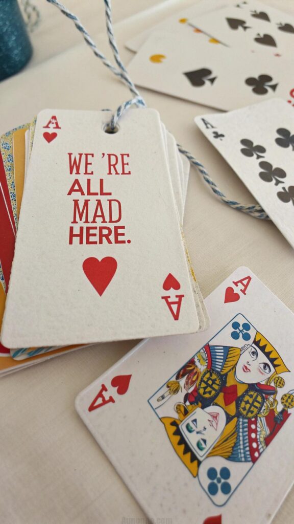 Incorporate playing cards into your decor in creative ways. Hang them from the ceiling, use them as place cards, or create a garland. This simple yet effective idea ties into the Wonderland theme.