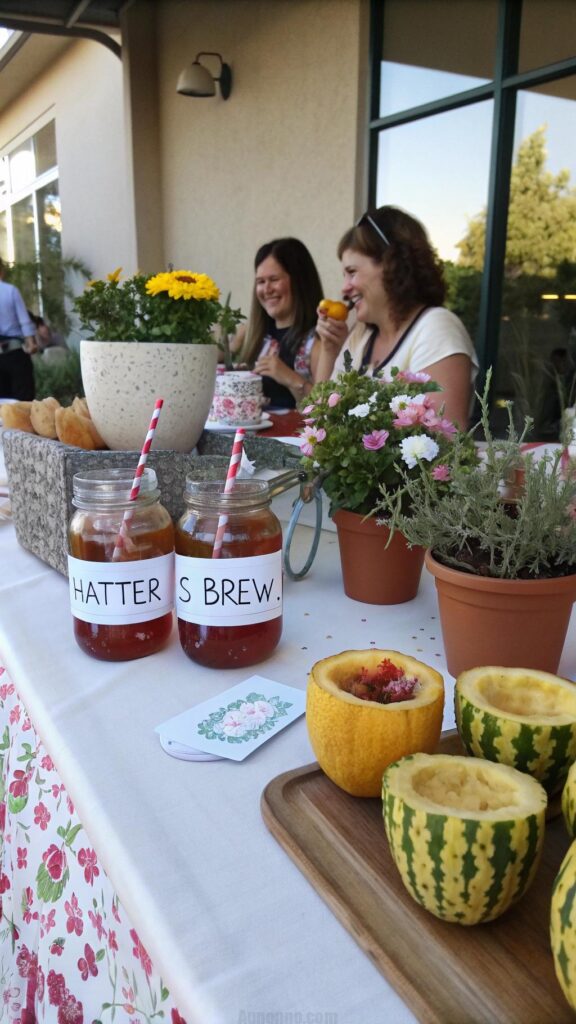 Label each container with a playful name or description. For example, a mason jar could be labeled “Hatter’s Brew.” This creative serving idea will surprise and delight your guests.