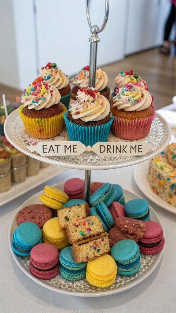 Serve treats like “Eat Me” cookies, “Drink Me” cupcakes, and tea-flavored macarons. Use edible glitter and bright colors to make the desserts pop. Display them on tiered trays for a dramatic effect.