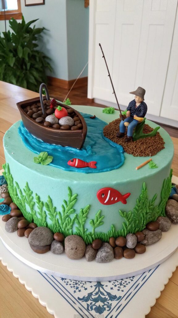 To enhance the fishing theme, you can incorporate elements like chocolate rocks or edible fishing lures to create a realistic fishing environment. This cake will not only be a delicious treat but also a celebration of his love for fishing, making it a perfect centerpiece for a lakeside or outdoor birthday party.