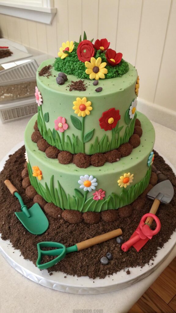 To enhance the gardening theme, you can incorporate elements like edible soil made from crushed cookies or chocolate rocks. This cake will not only be visually appealing but also celebrate his love for gardening, making it a perfect fit for a garden party.