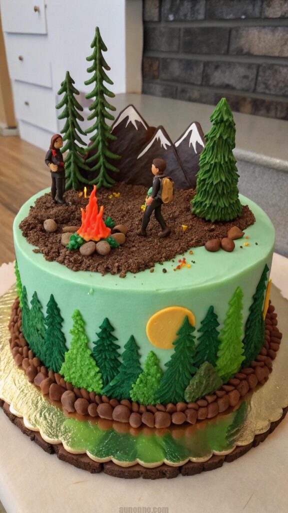 To enhance the outdoor theme, you can incorporate elements like chocolate rocks or graham cracker crumbs to mimic dirt and gravel. This cake will not only satisfy his sweet tooth but also celebrate his love for nature and adventure, making it a perfect fit for an outdoor birthday party.