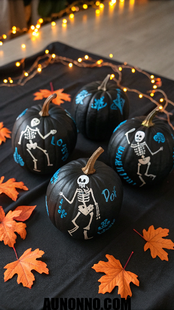 Skeleton-decorated pumpkins balance spooky and playful perfectly. Paint mini pumpkins in black or dark purple as your base color using acrylic paint. Apply two coats for solid coverage.​