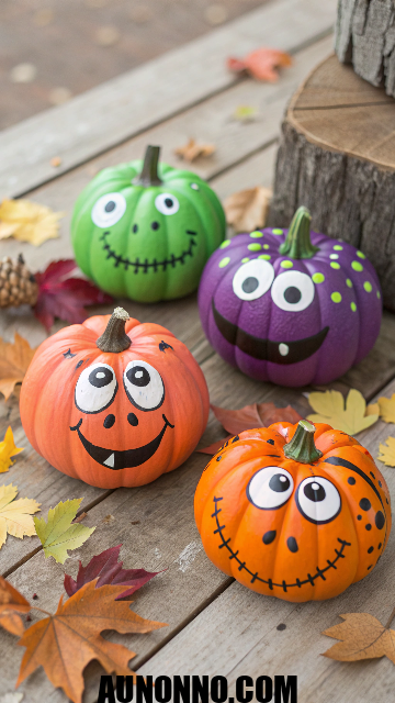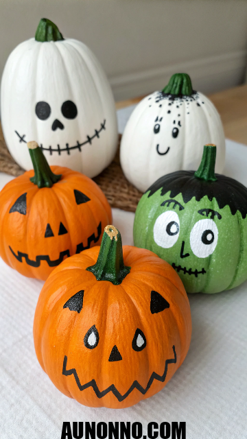 Character pumpkins bring beloved Halloween icons to life. Paint mini pumpkins orange for jack-o’-lanterns, white for ghosts, or black for witches. Simple features make these characters instantly recognizable without advanced artistic skills.​
