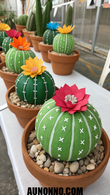 Top some pumpkins with mini honeycomb balls in pink, orange, or yellow to represent cactus blooms. For extra realism, place these painted cacti in terracotta pots filled with moss. Create different heights by using various pumpkin sizes to mimic different cactus varieties. These quirky pumpkins add unexpected charm and work year-round as non-seasonal decor.​